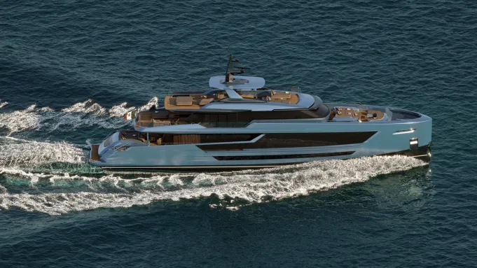 Interior renders have not yet been revealed, but the yard describes the living quarters as “modern, balanced, soft, and elegant.” Up to 10 guests can sleep across five en suite cabins, including a full-beam owner’s suite on the main deck forward and two doubles and two twins on the lower deck. Separate crew quarters can accommodate up to eight. Relaxation spots also abound, with a skylounge, sundeck, and sunpads forward and aft.